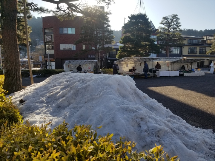 陣屋広場に残っている、雪山もかなり低くなってまいりました。